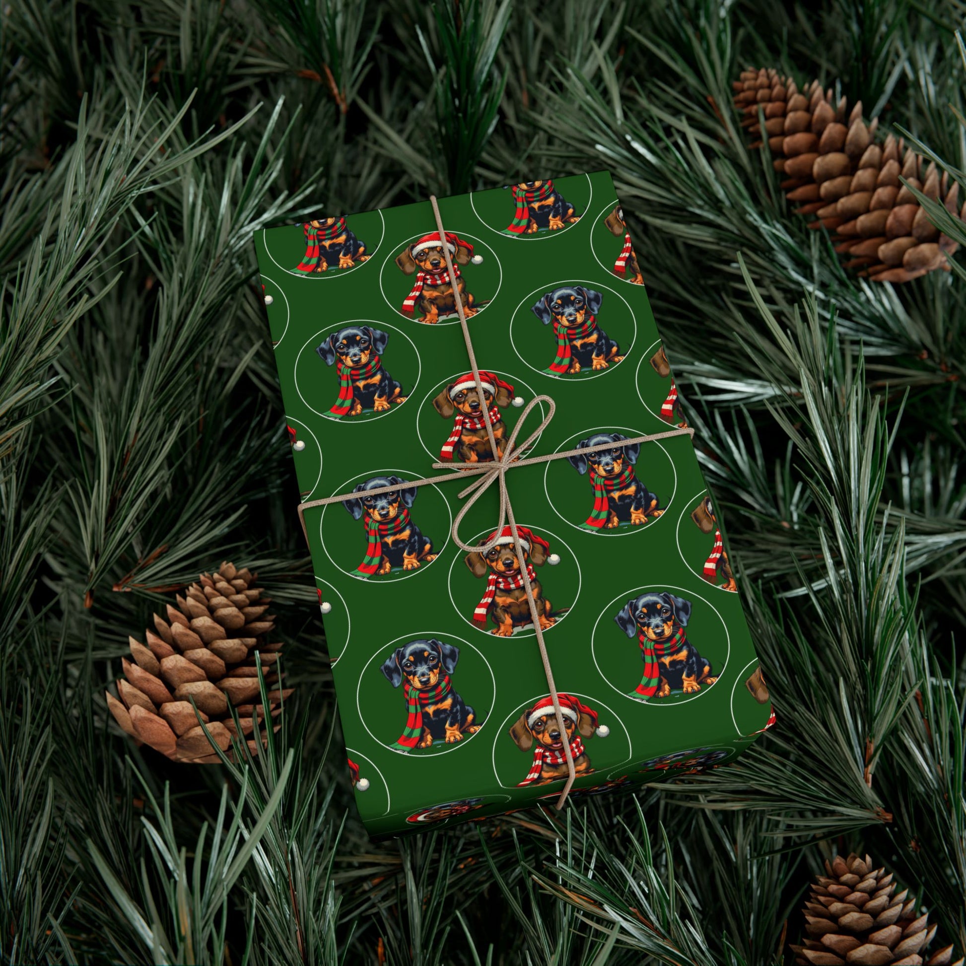 This roll of gift wrap turns gift-giving into a warm, cozy moment. Deep evergreen paper is patterned with tiny, cheerful dachshunds wearing holiday hats and scarves — each pup framed in a soft circular motif that reads like a string of ornaments across the sheet. The finish options let you choose a subtle satin sheen or a refined matte look, and the sturdy, flexible paper holds crisp folds without cracking. Bright, water-based inks keep colors lively while meeting Greenguard standards, and the recyclable paper keeps the celebration a little kinder to the planet. Wrap a small box for a pet-lover, line a drawer with festive color, or make every parcel look cared-for and handcrafted.