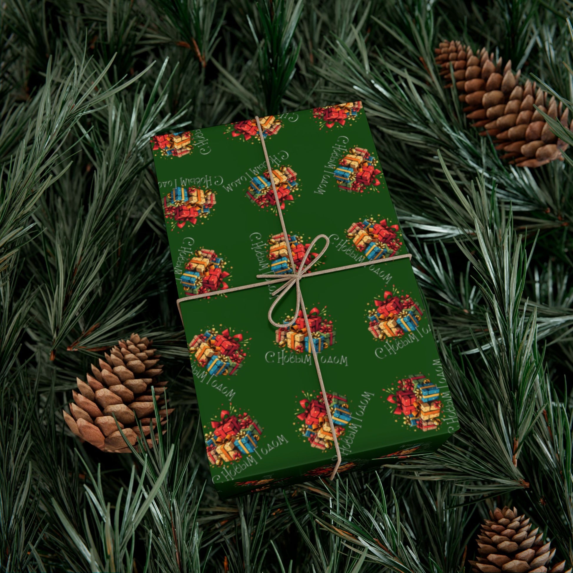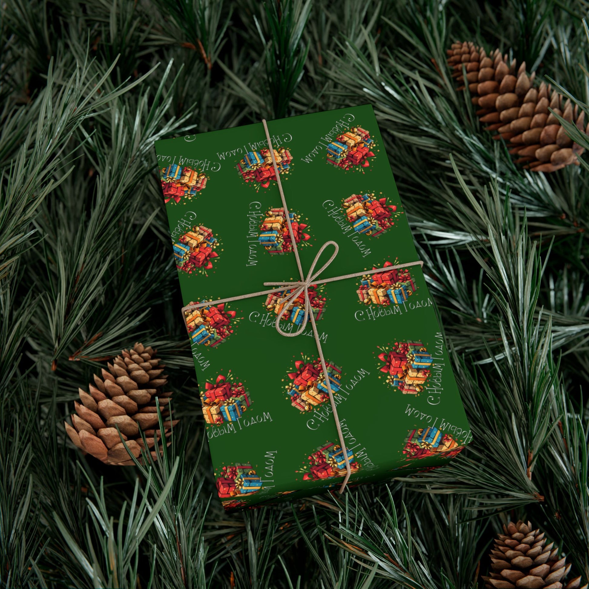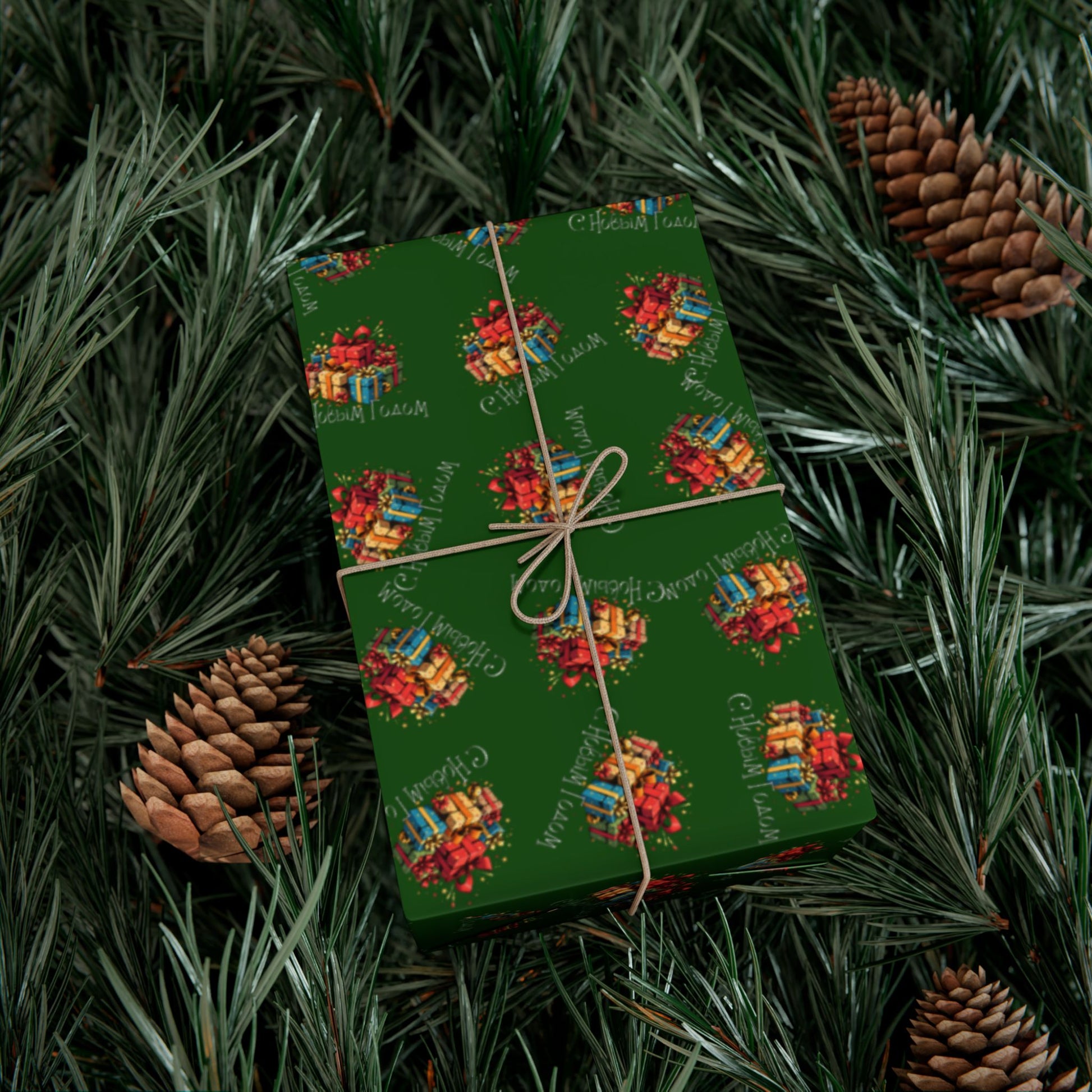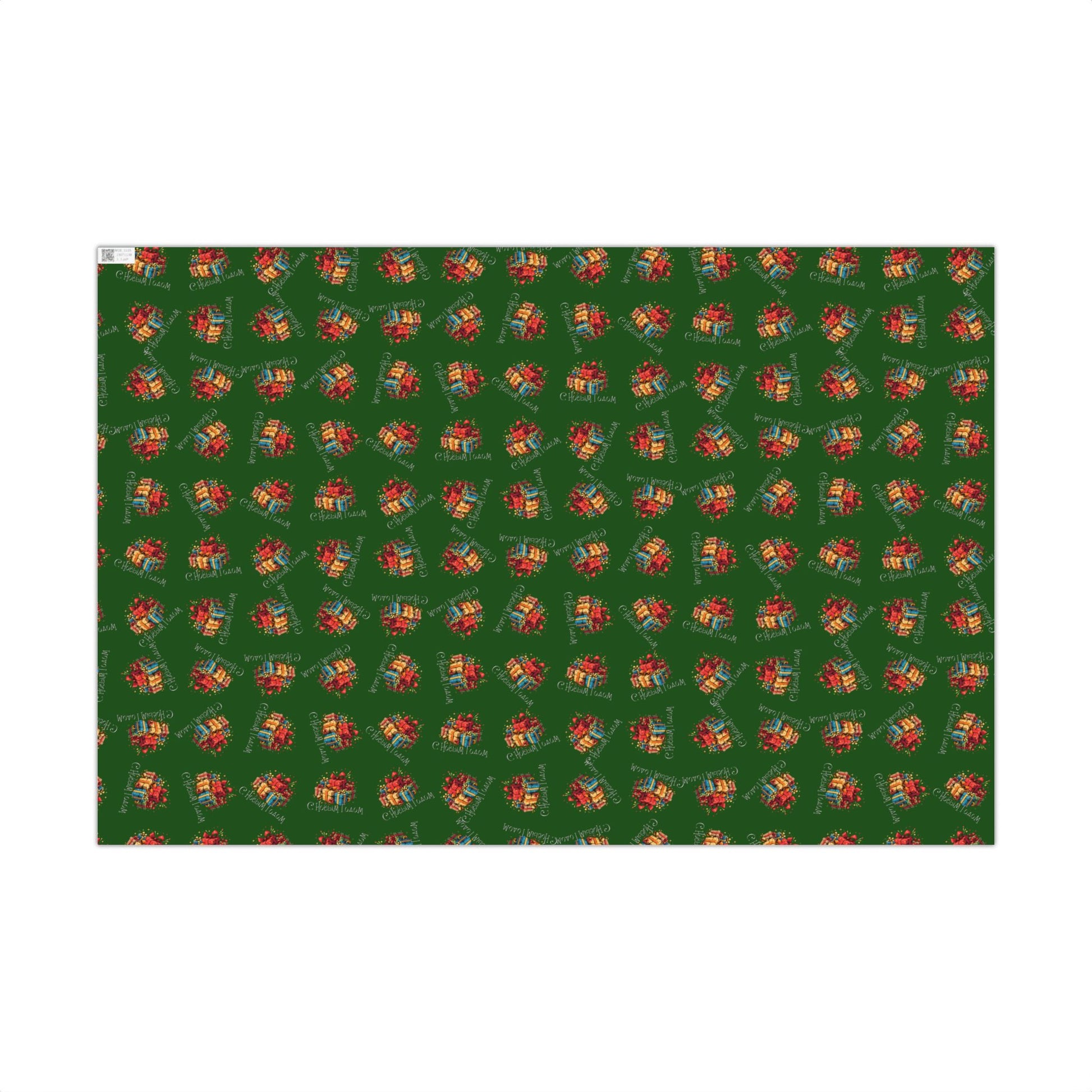 Rich, deep forest-green wrapping paper patterned with tiny stacks of brightly wrapped gifts — each bundle painted in warm reds, golds, and jewel tones. The paper lies smooth and substantial in the hands: fold it crisply around boxes for a clean, polished look or keep a softer drape for parcels tied with twine. The water-based, Greenguard-certified inks produce colors that pop without harsh chemicals, and the durable, scratch- and water-resistant finish stands up to busy holiday wrapping sessions. Choose satin for a soft sheen that catches candlelight, or matte for a cozy, old-fashioned vibe. Sized options and recyclable materials make it an easy choice when you want seasonal wrapping that looks thoughtful and lasts until the ribbon is untied.