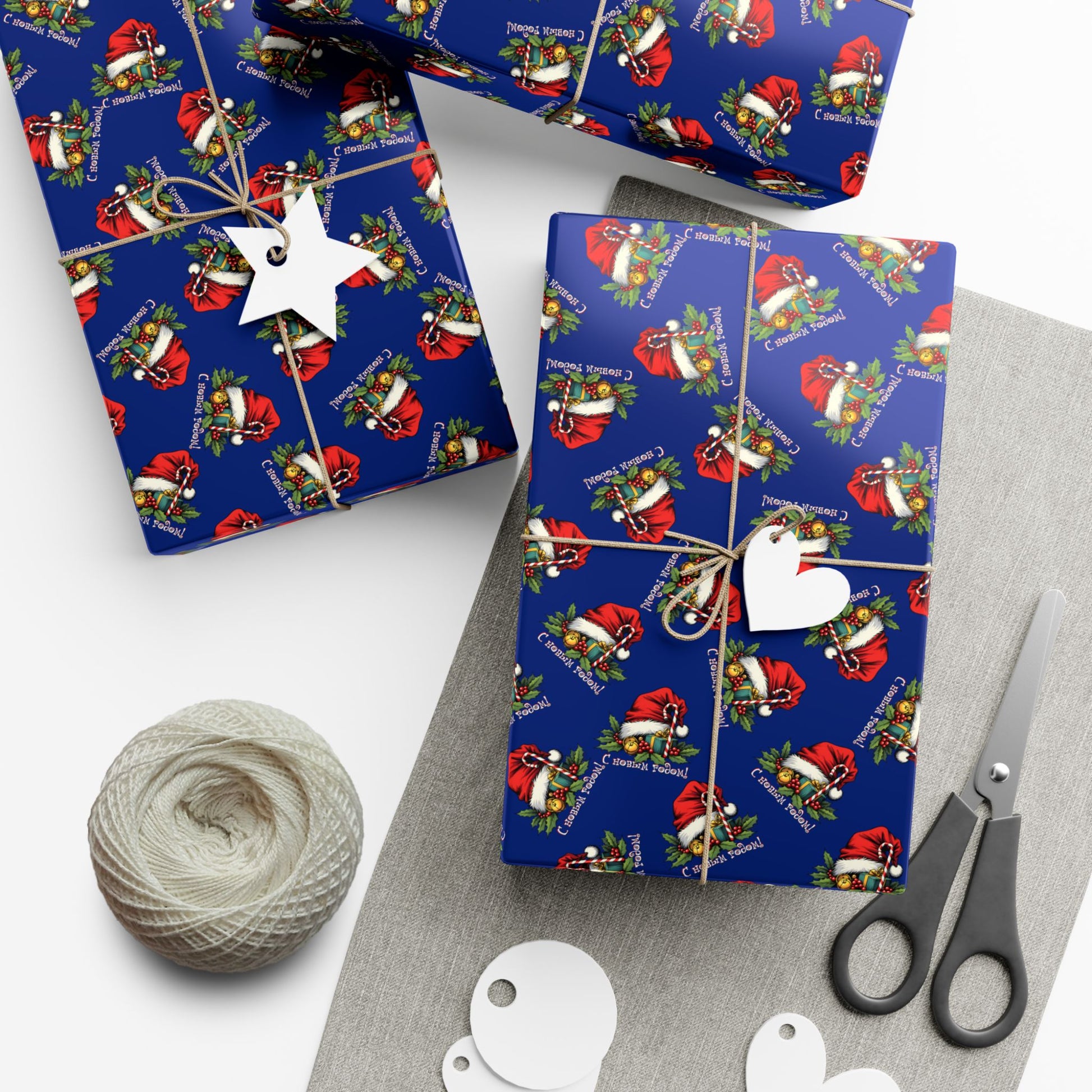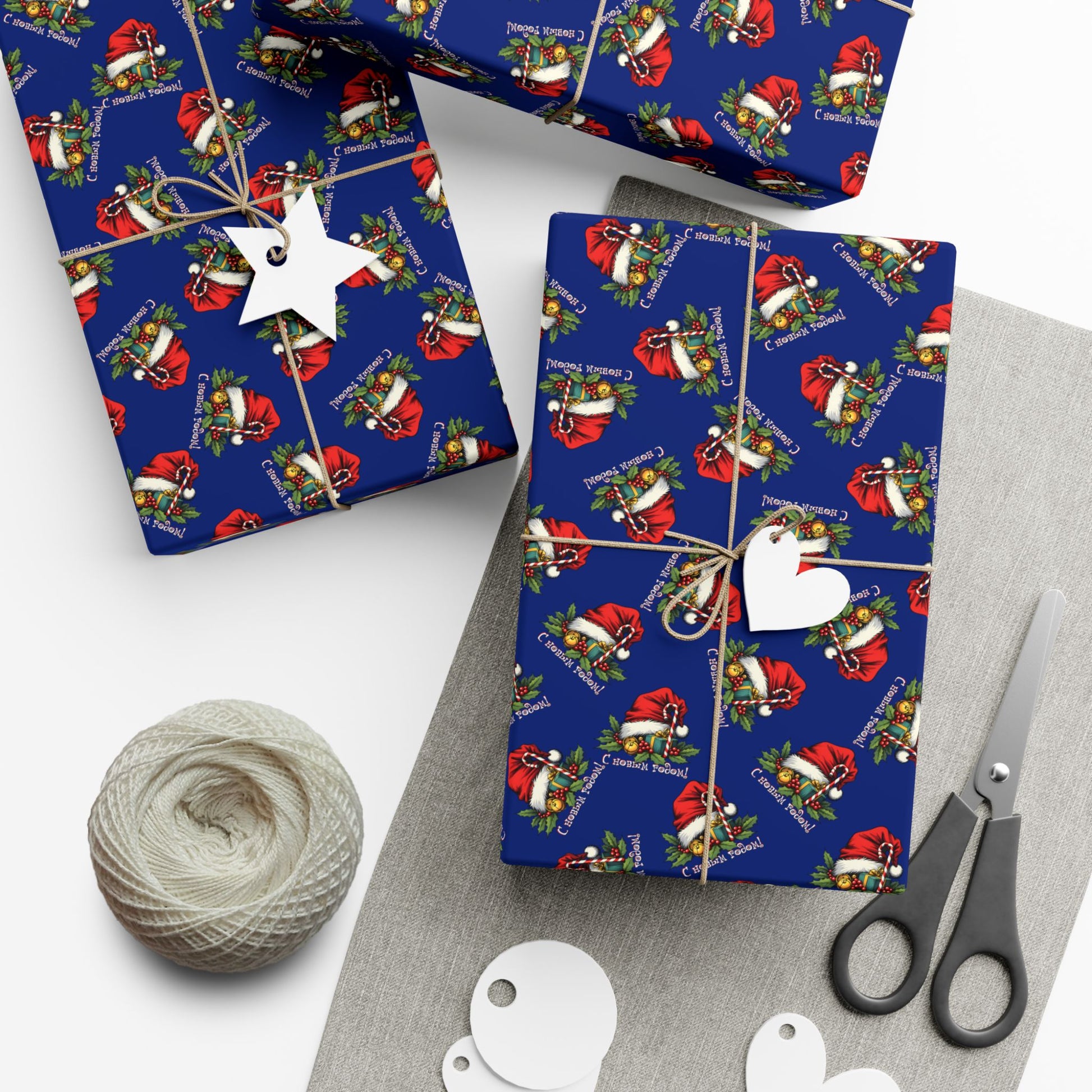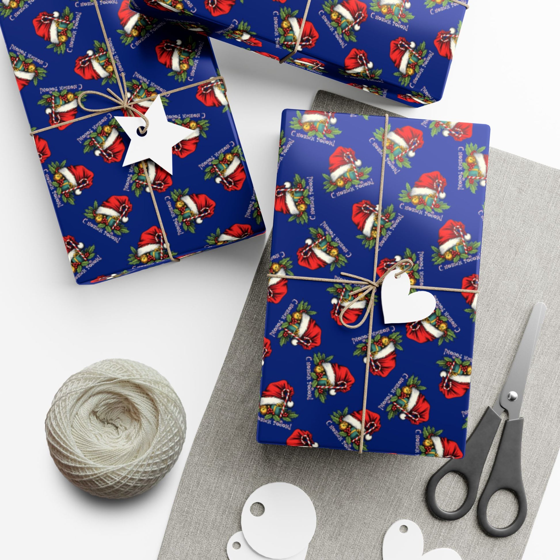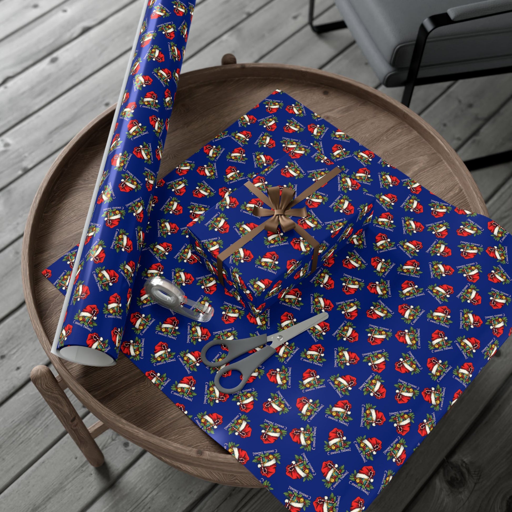 Deep navy gift wrap patterned with a joyful holiday motif — tiny Santas, holly sprigs and wrapped presents scattered across a rich blue field. The look is playful yet refined: colors print bright and crisp, and your parcels take on a polished, festive presence whether you’re wrapping stocking stuffers or thoughtful hostess gifts. The paper holds creases without cracking and stands up to light handling, keeping bows and twine looking neat. Choose a satin finish for a softly reflective sheen or a matte finish for a more modern, tactile feel. Printed with water-based, Greenguard UL certified inks and fully recyclable, this wrap brings seasonal cheer with attention to craft and sustainability.