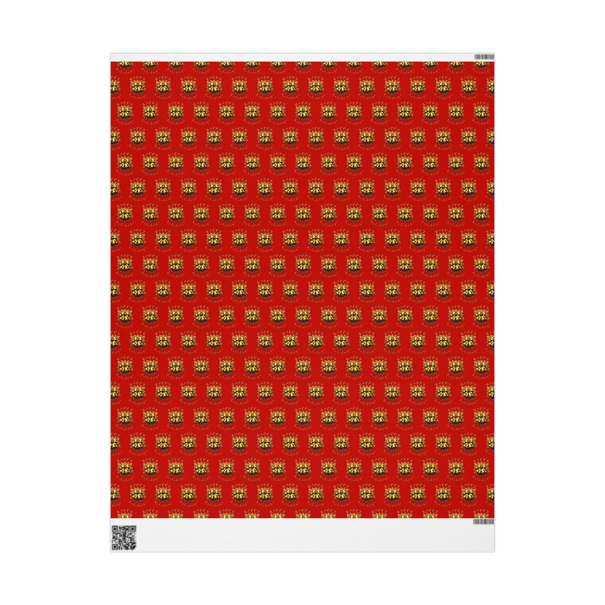 This vibrant wrapping paper brings joyful holiday energy to every present. A repeating motif in warm golds and blacks pops against a rich red background, creating a classic-yet-playful look that reads handcrafted and festive. The design feels like a cozy gathering — candlelight, laughter, and careful hands tying ribbon. Choose glossy for a bright, luxe sheen or matte for an elegant, velvety finish. Available in long rolls so you can wrap many packages for holiday gatherings, winter exchanges, and cozy at-home celebrations. Note: one-sided print with small white trim at the roll edges containing a barcode and QR code.