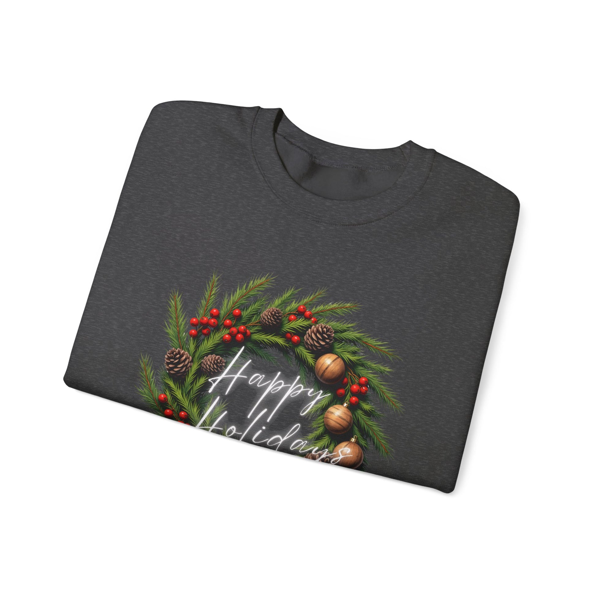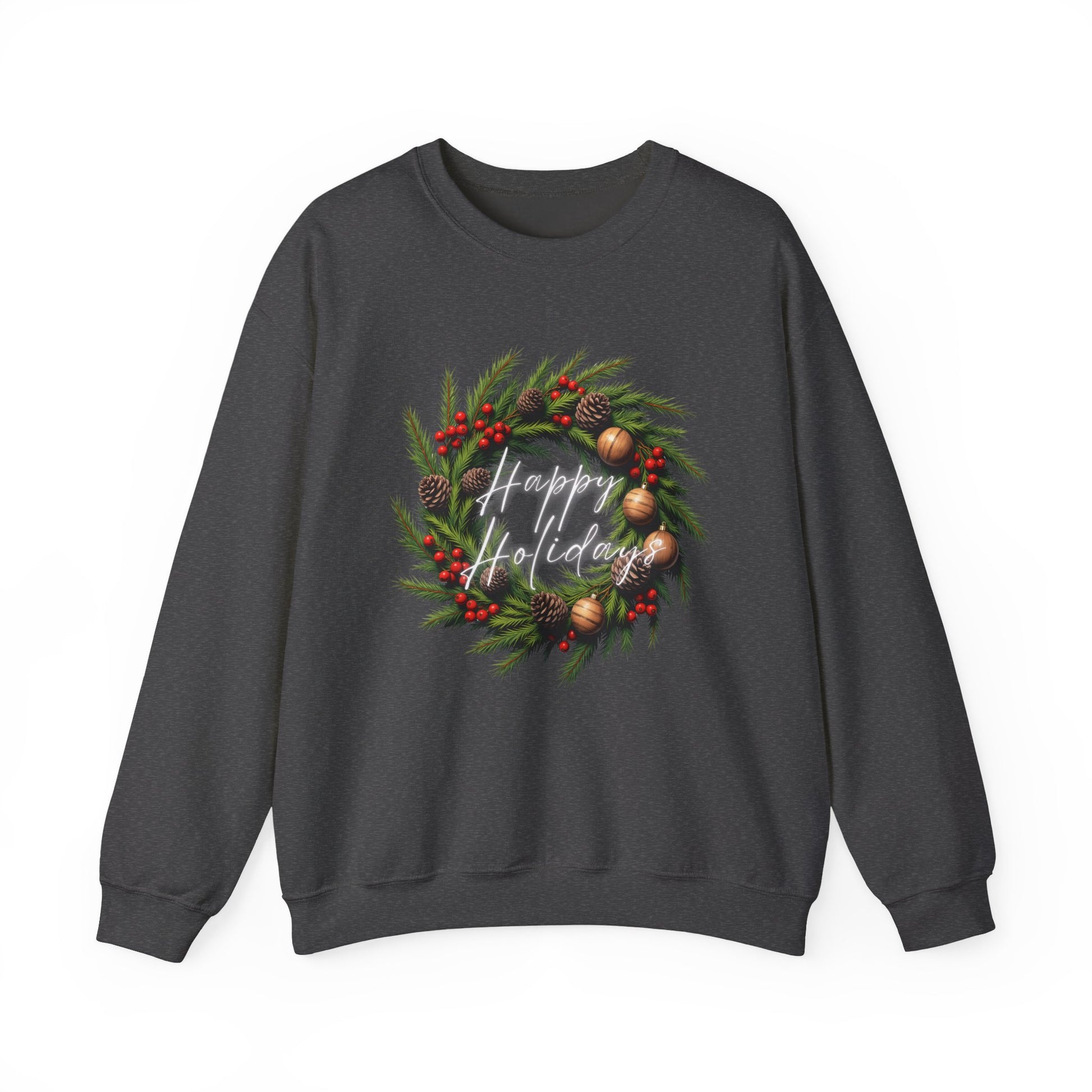 Soft, warm, and quietly festive — this crewneck brings a hand-crafted holiday wreath to your everyday rotation. The wreath illustration sits centered on a clean white sweatshirt, its pine needles, red berries, and brass ornaments detailed with painterly texture that catches the eye without shouting. Wear it on chilly mornings while sipping coffee, at low-key holiday gatherings, or during slow walks through neighborhood lights. The classic cut and medium-heavy fabric drape comfortably over layers and move with you, turning simple comfort into a calm seasonal statement.