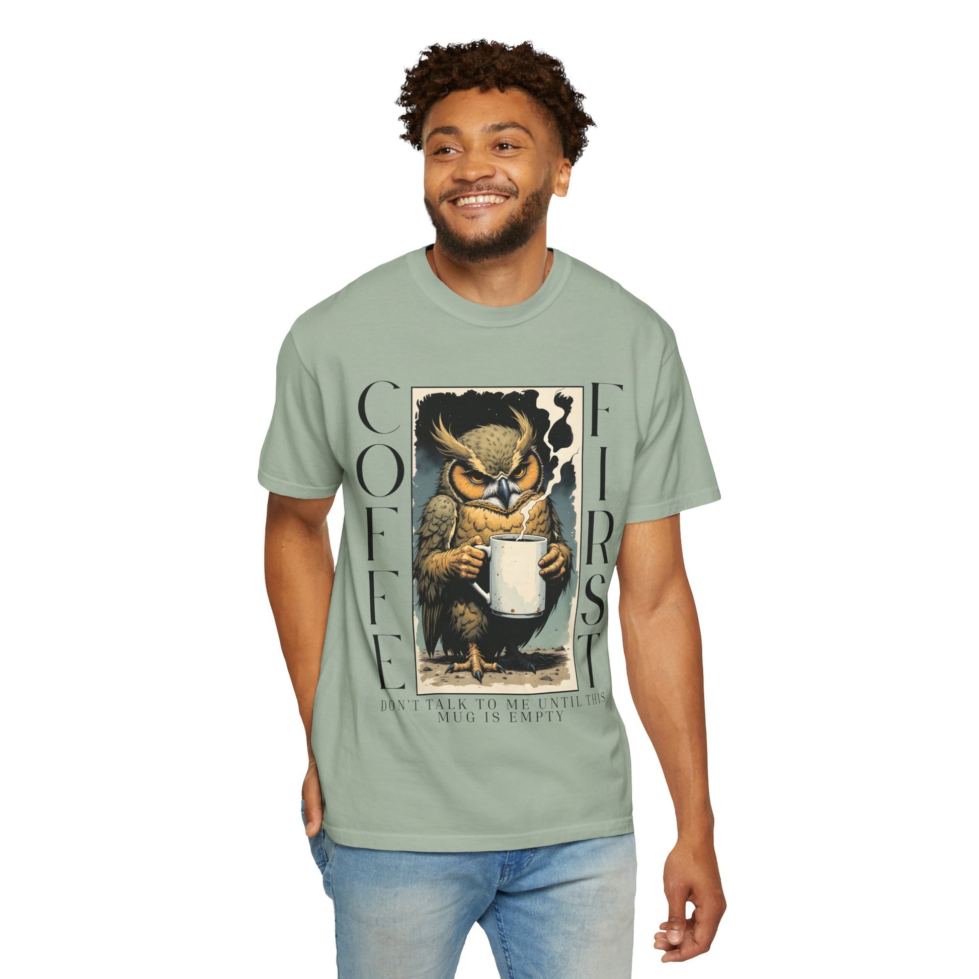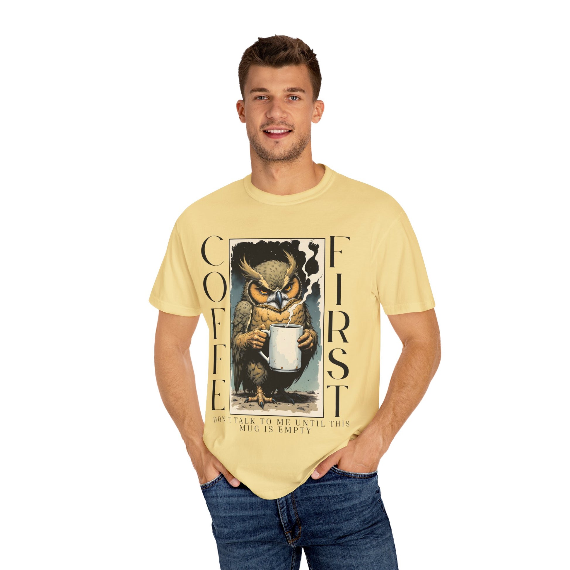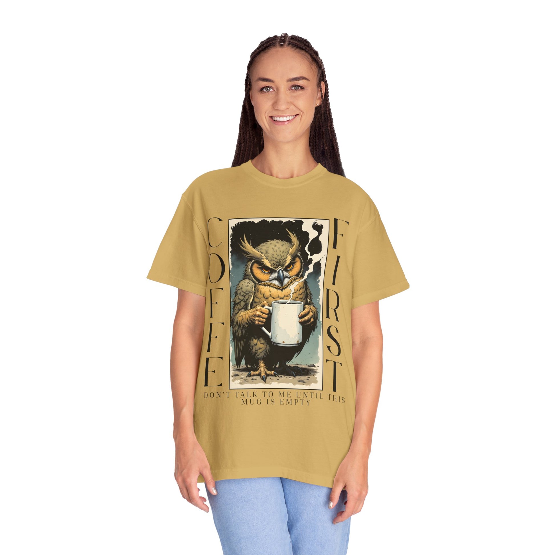 A laid-back, garment-dyed tee that speaks to slow mornings and stubborn caffeine devotion. The front print shows a grumpy, wide-eyed owl clutching a steaming mug, surrounded by elegant type that reads COFFEE FIRST — a little dark humor for people who don’t do conversation before their first cup. The medium-weight 100% ring-spun cotton softens with wear, the relaxed cut layers easily under a flannel or stands alone with jeans, and the muted dye gives the shirt a lived-in, vintage feel. Wear it on early commutes, weekend coffee runs, or while you nurse that first glorious mug at sunrise — it’s made to fade into your routines and feel more yours each wash.