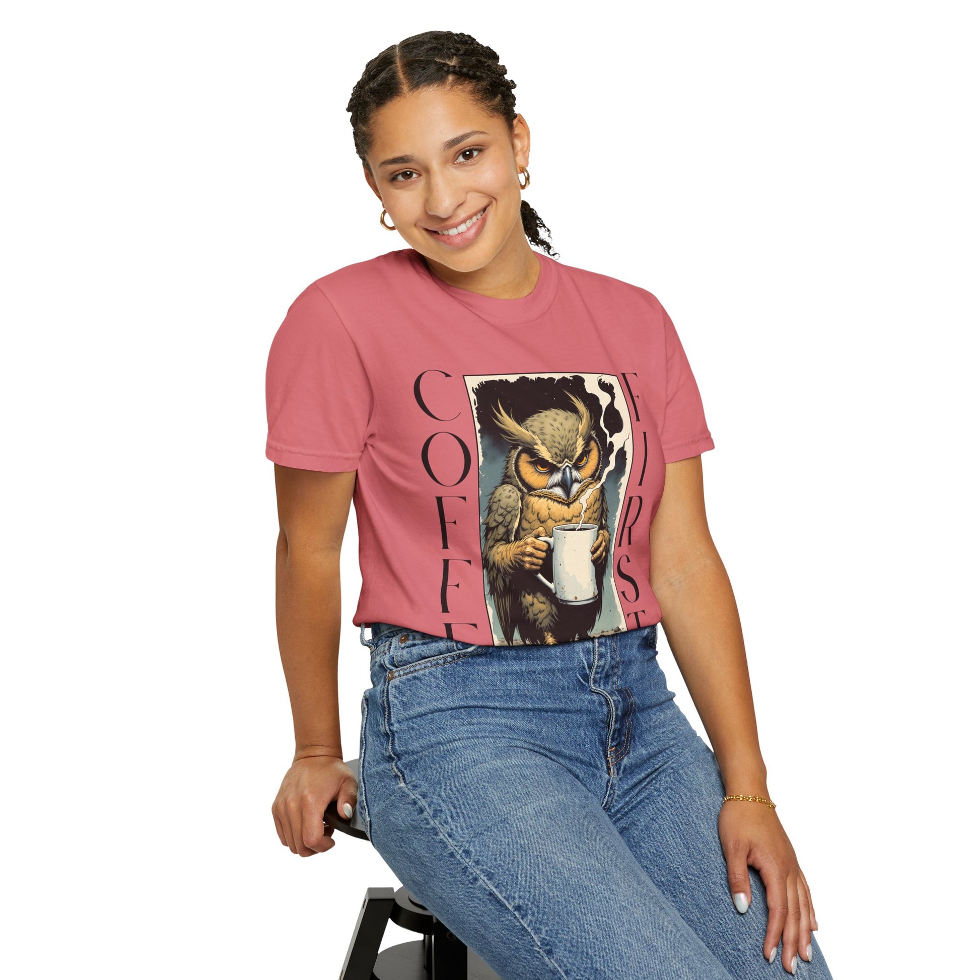 Coffee First Owl T-Shirt — Vintage Owl Holding Graphic Tee