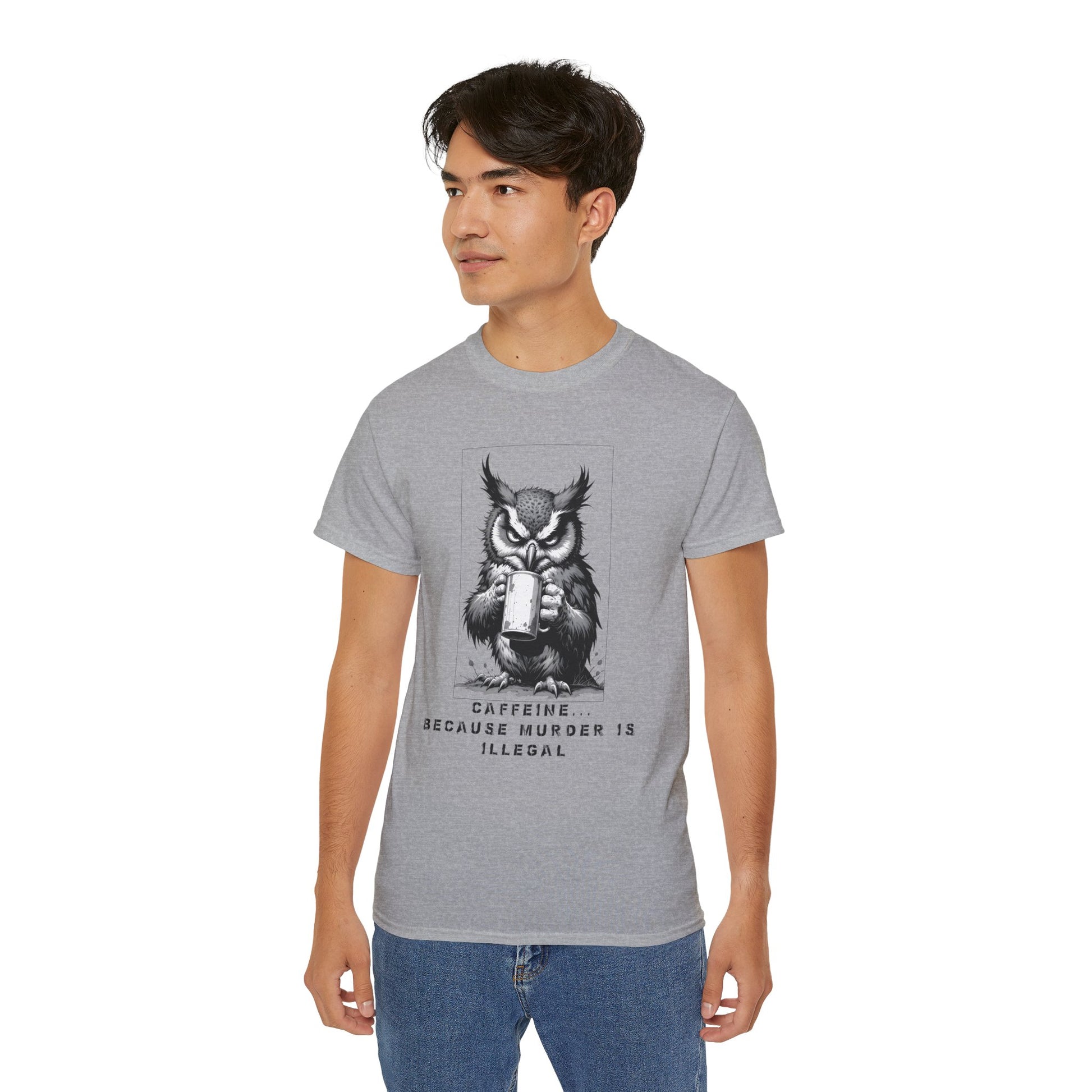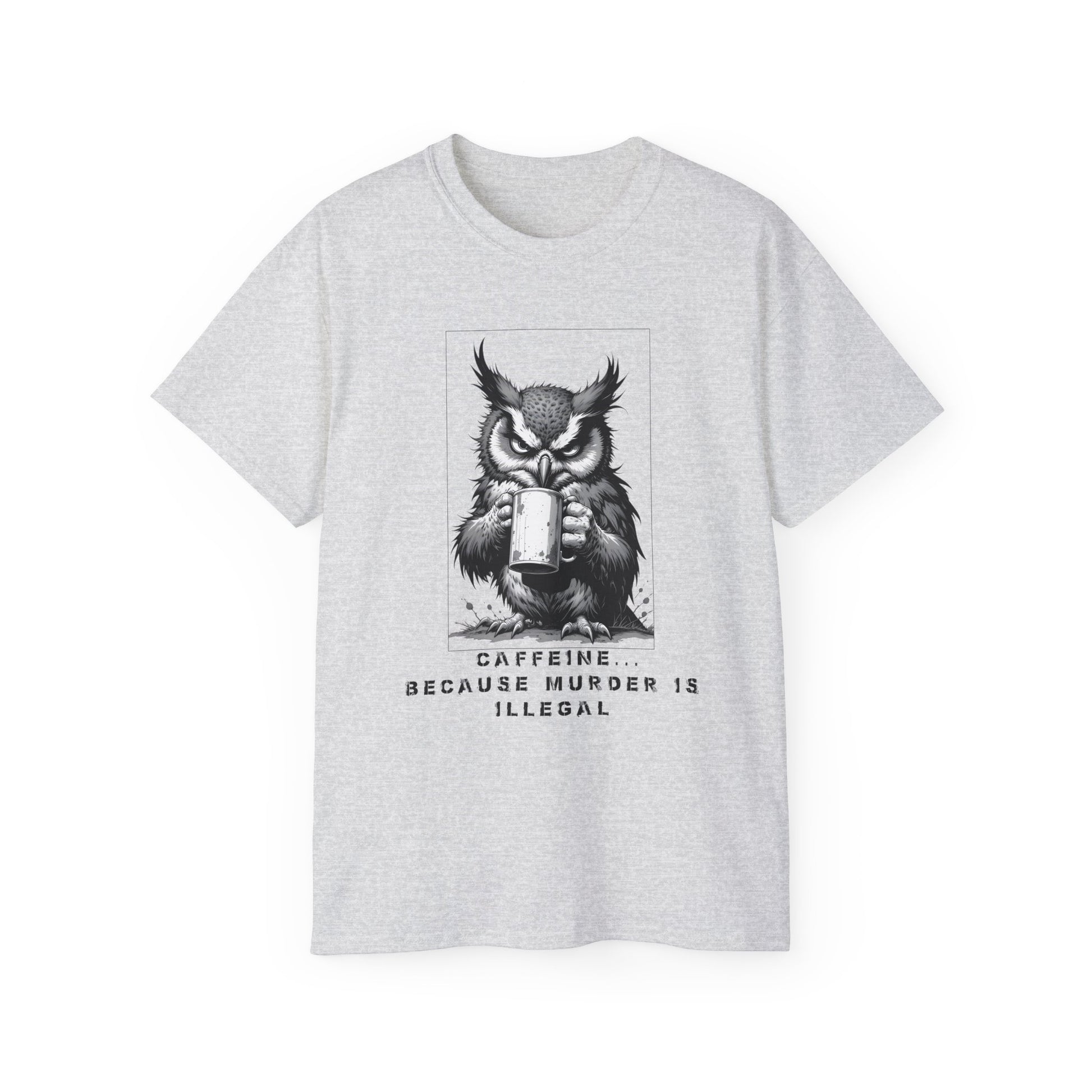Coffee Owl T‑Shirt — "Caffeine Because Murder Is Illegal" Funny Graphic Tee