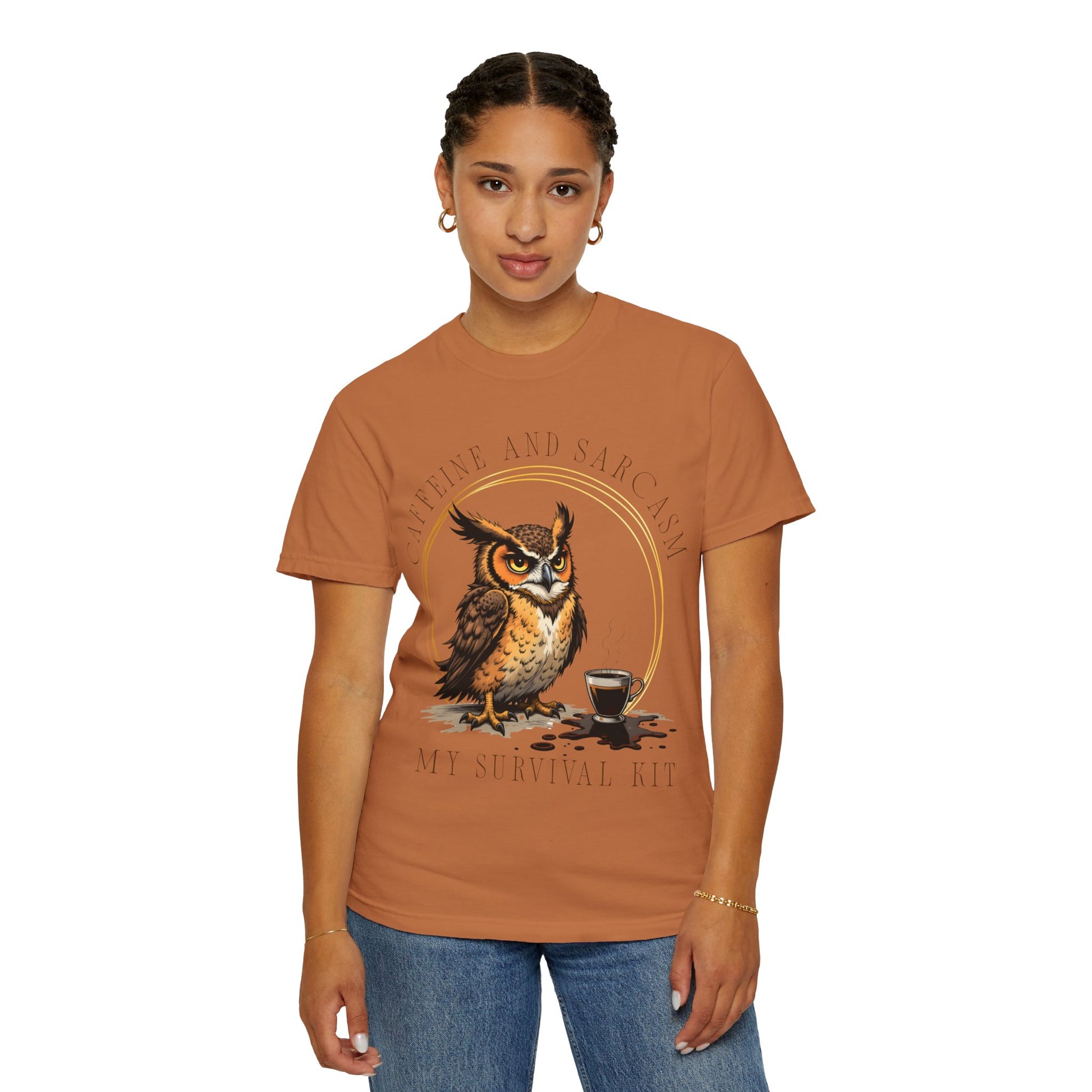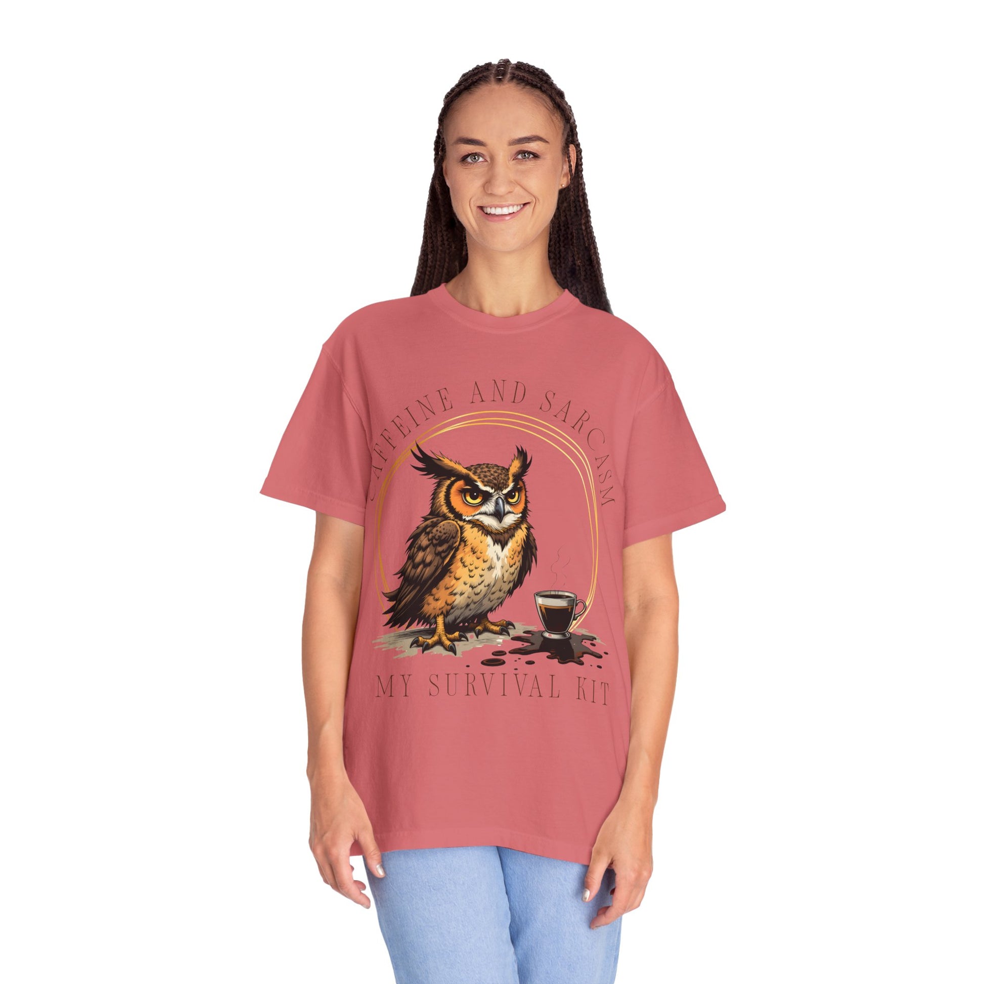 Coffee & Sarcasm Owl T-Shirt — "My Survival Kit" Graphic Tee