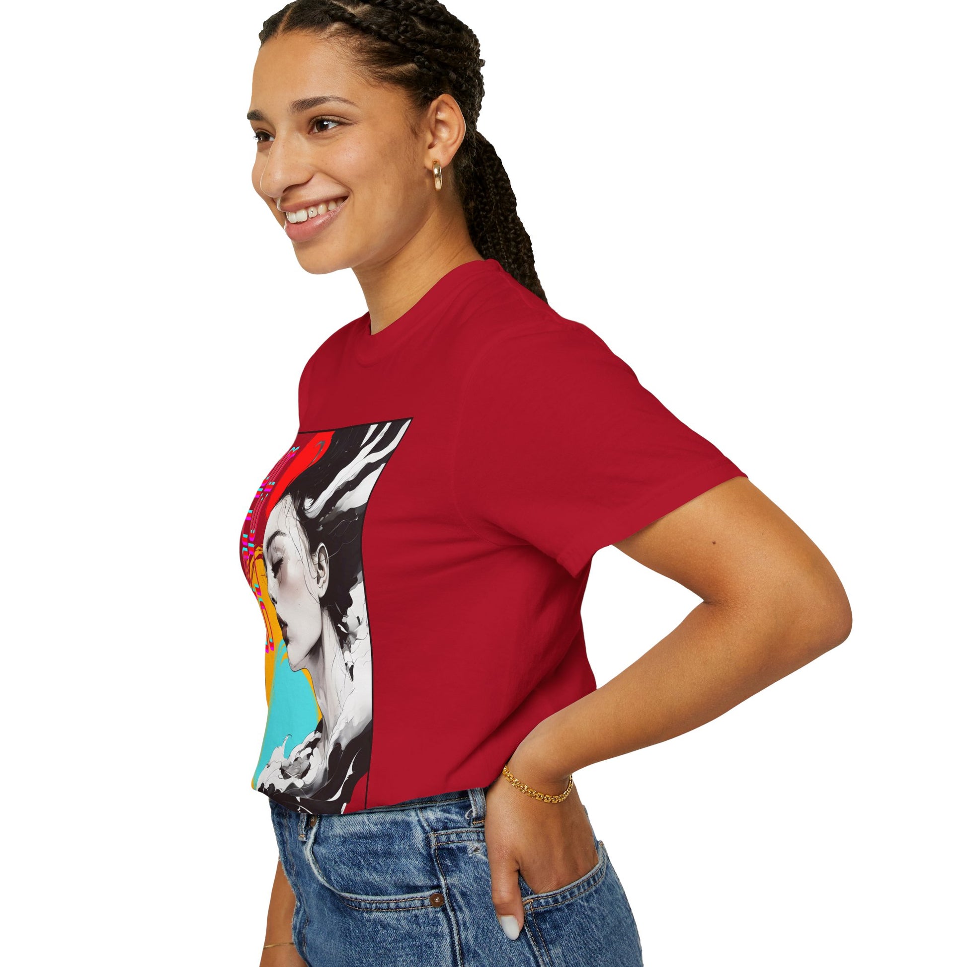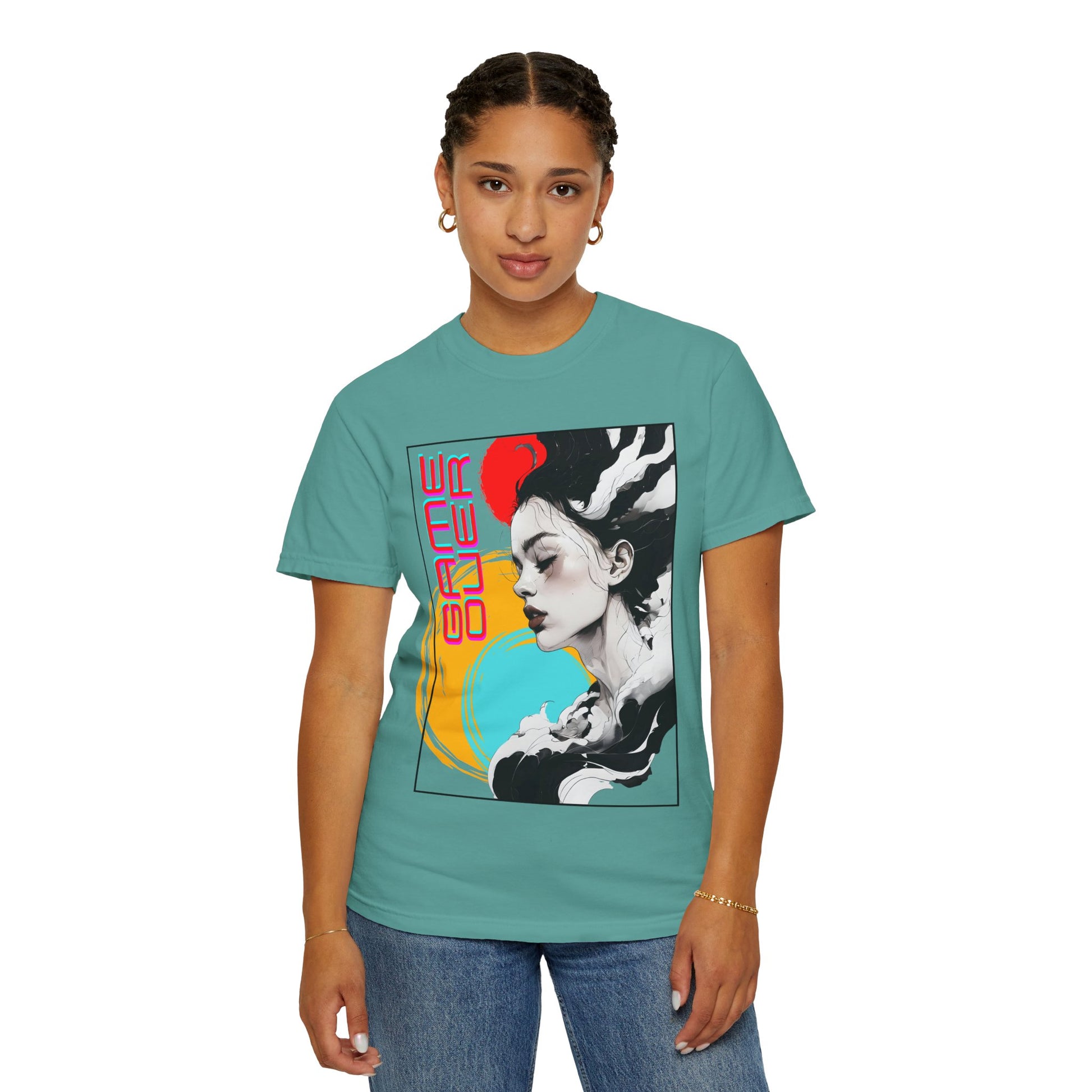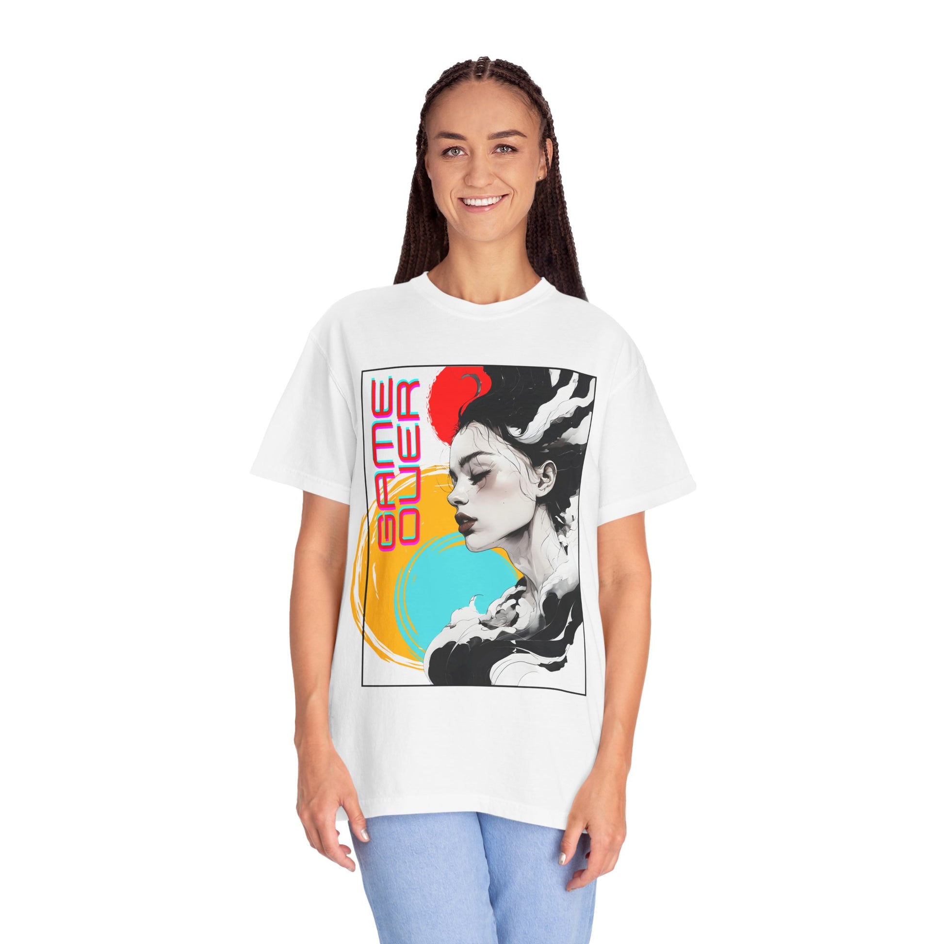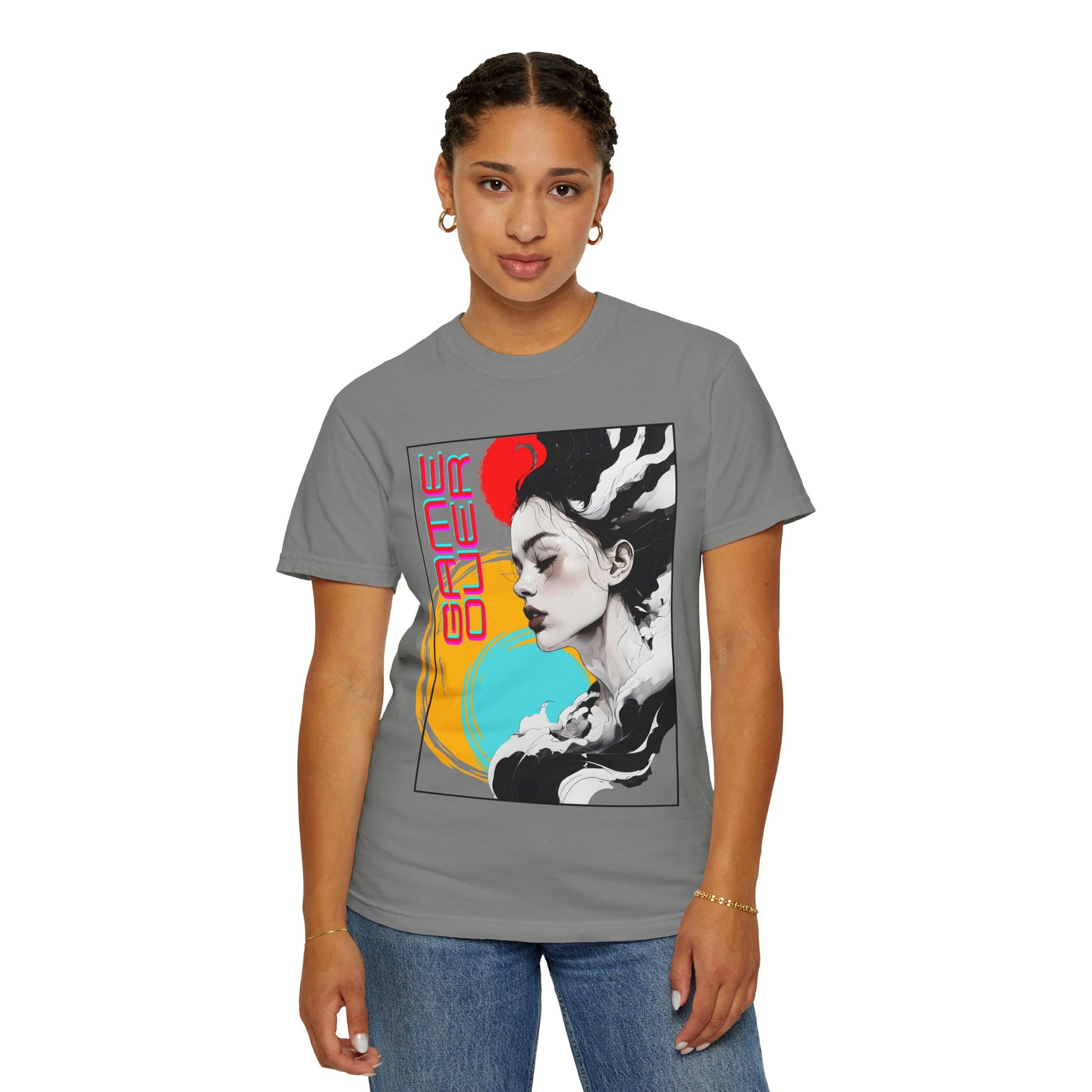 This relaxed-fit garment-dyed tee brings artful edge to everyday wear. A soft, lived-in hand comes from garment-dyeing, while the bold front graphic—an evocative portrait framed by neon circles and the words “GAME OVER”—adds a retro-futurist, arcade-inspired mood. It drapes easily across the body for casual layering or solo wear, the tubular knit and double-needle stitching give it structure that lasts, and the pre-shrunk ring-spun cotton keeps the fit consistent wash after wash. Wear it when you want to blend streetwise style with a touch of nostalgic, cyber-art storytelling.