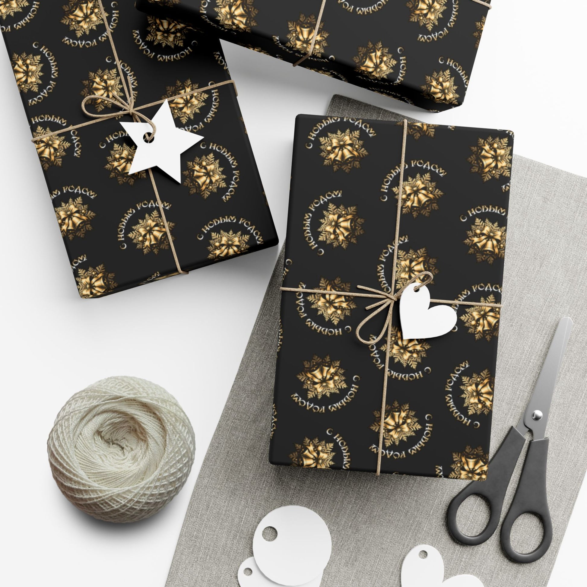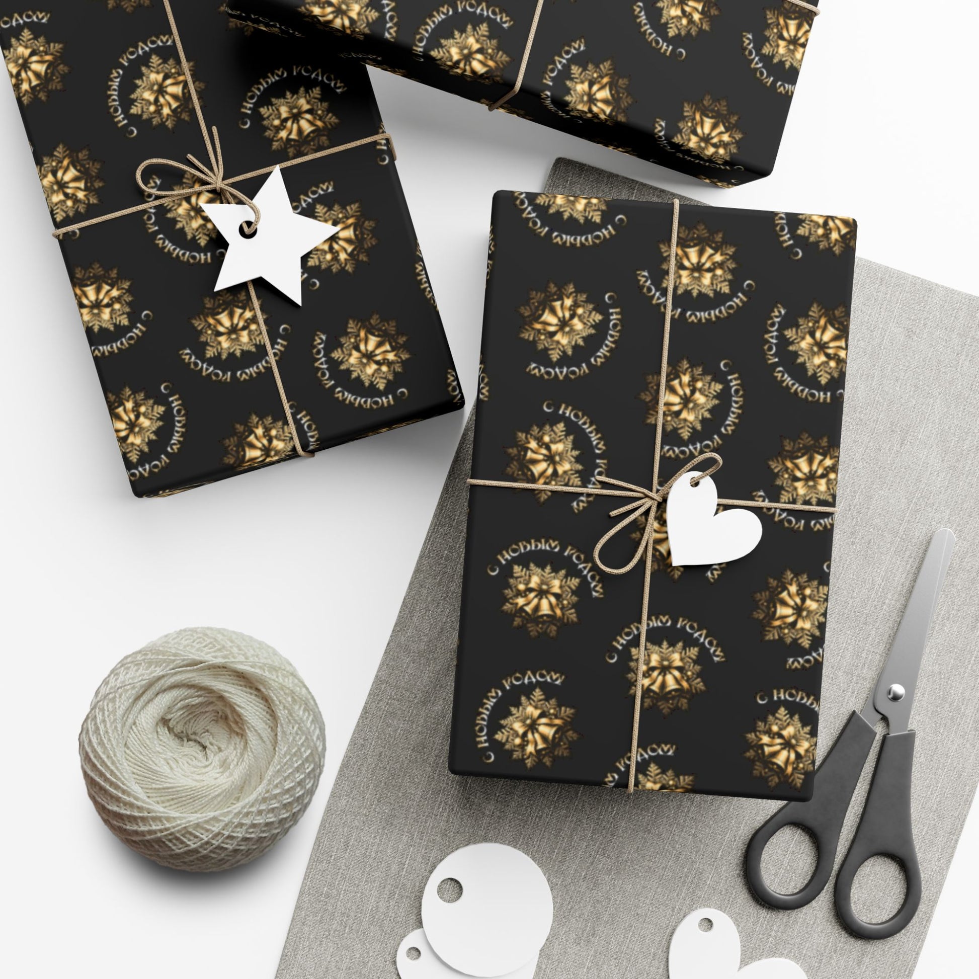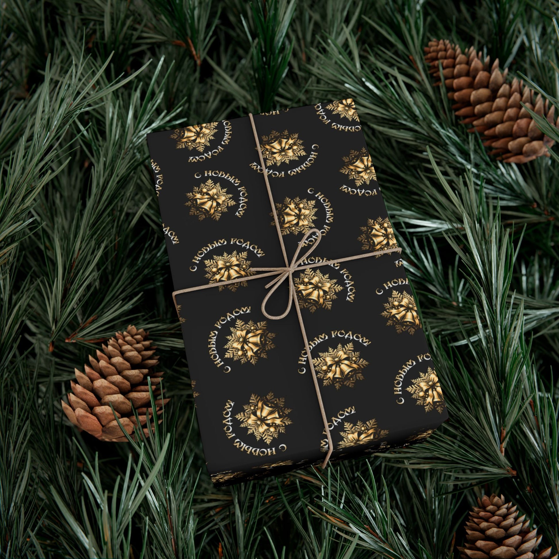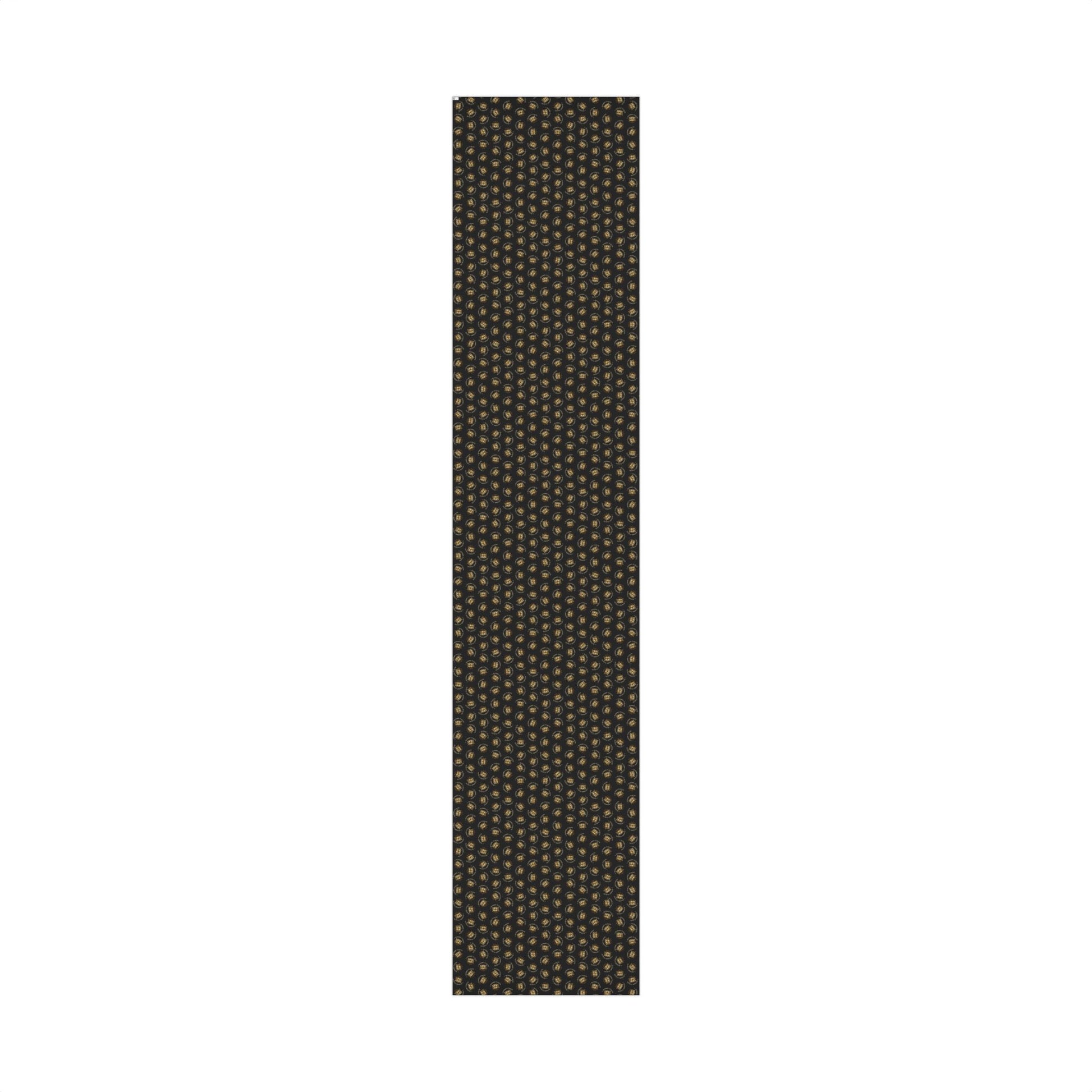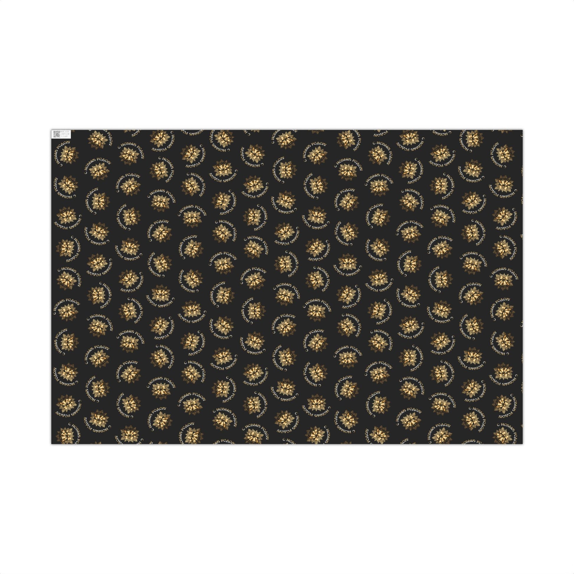 Deep charcoal wrapping paper patterned with small, luminous golden wreaths that read like hand-stamped seals. Each roll brings a quiet, refined celebration—subtle shine on the satin option or a modern, velvety look with matte. The paper holds crisp folds without cracking and resists light scratches or moisture while you tie natural twine or ribbon around a box. Printed with water-based, Greenguard UL certified inks on recyclable 100% paper, it’s made to dress up gifts for cozy winter gatherings, elegant birthday presents, or thoughtful housewarmings that call for a low-key, luxurious touch.