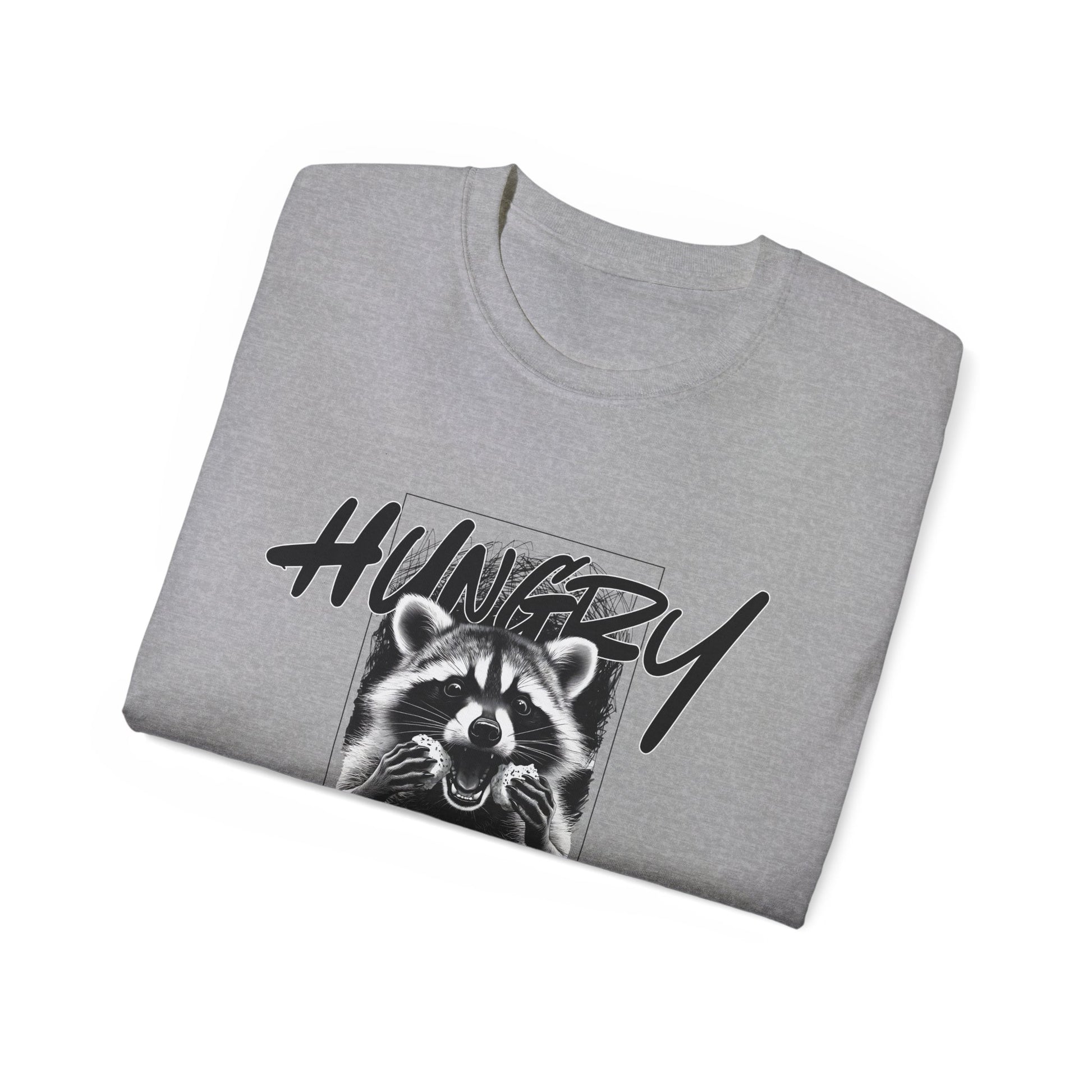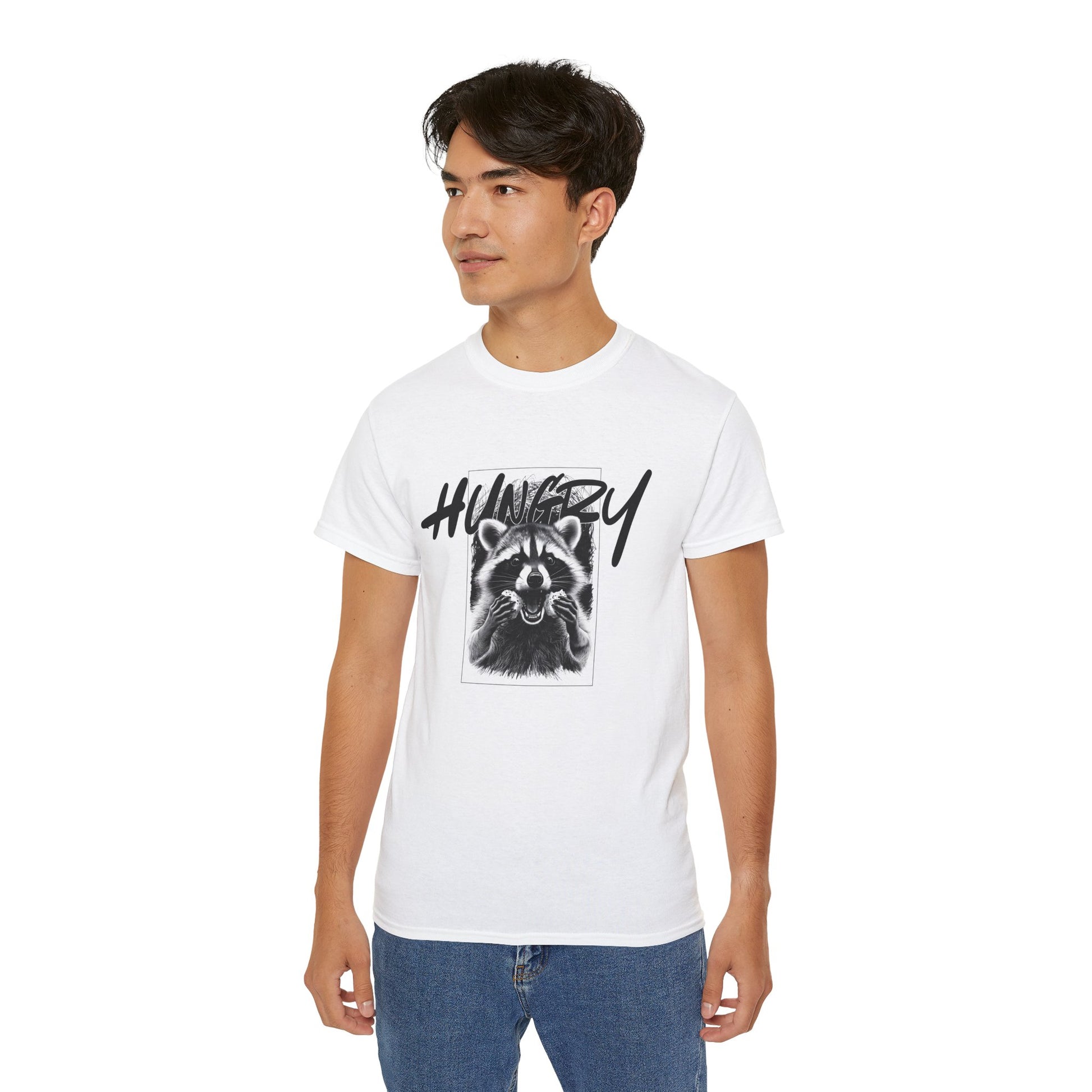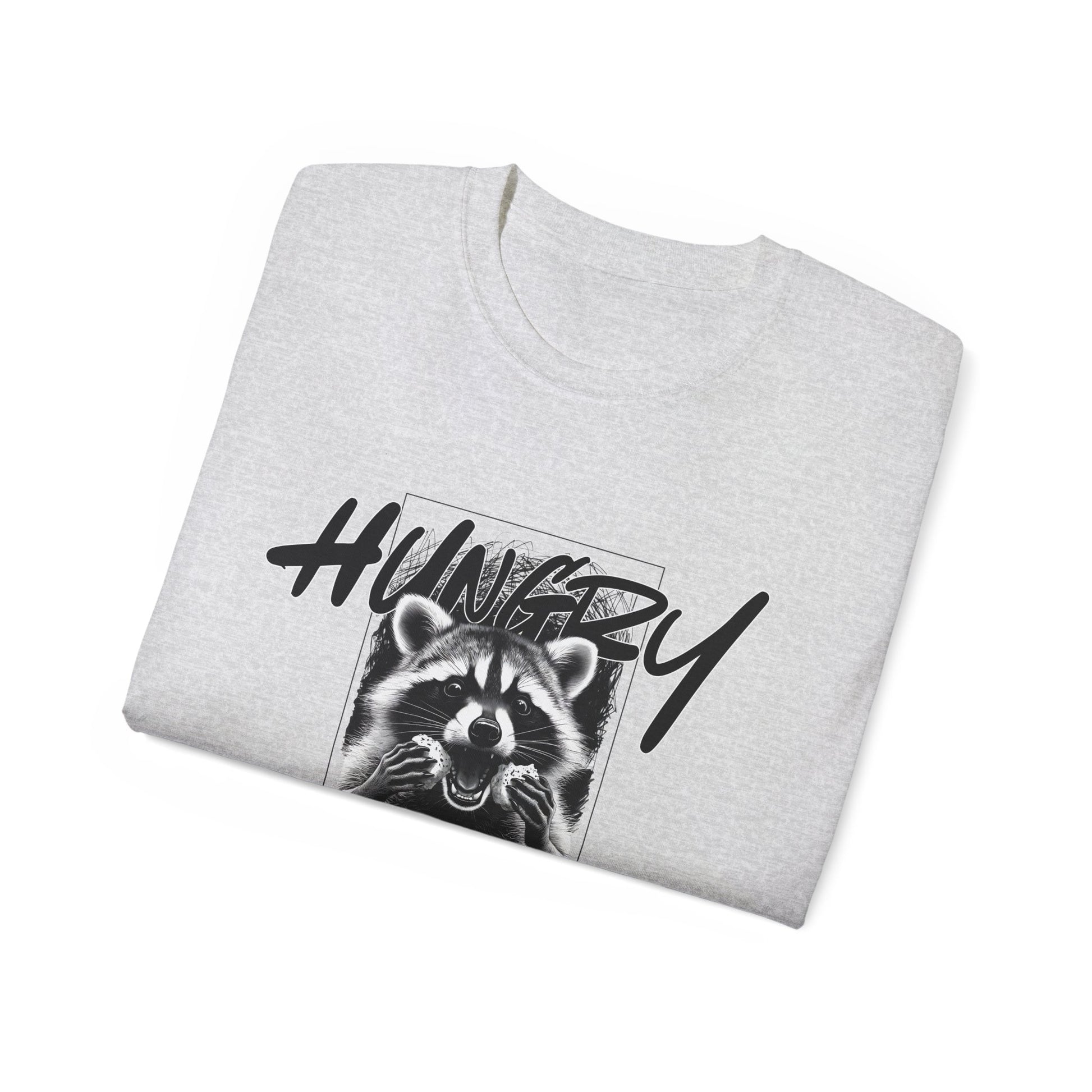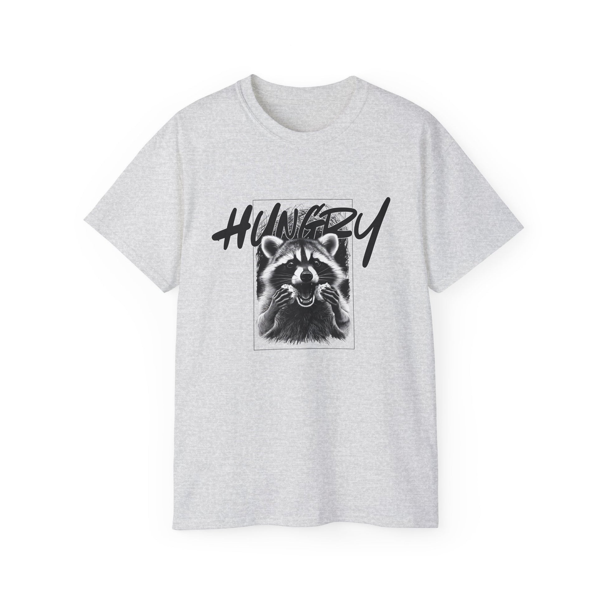Hungry Raccoon Graphic Tee – Vintage Black & White Animal T-Shirt