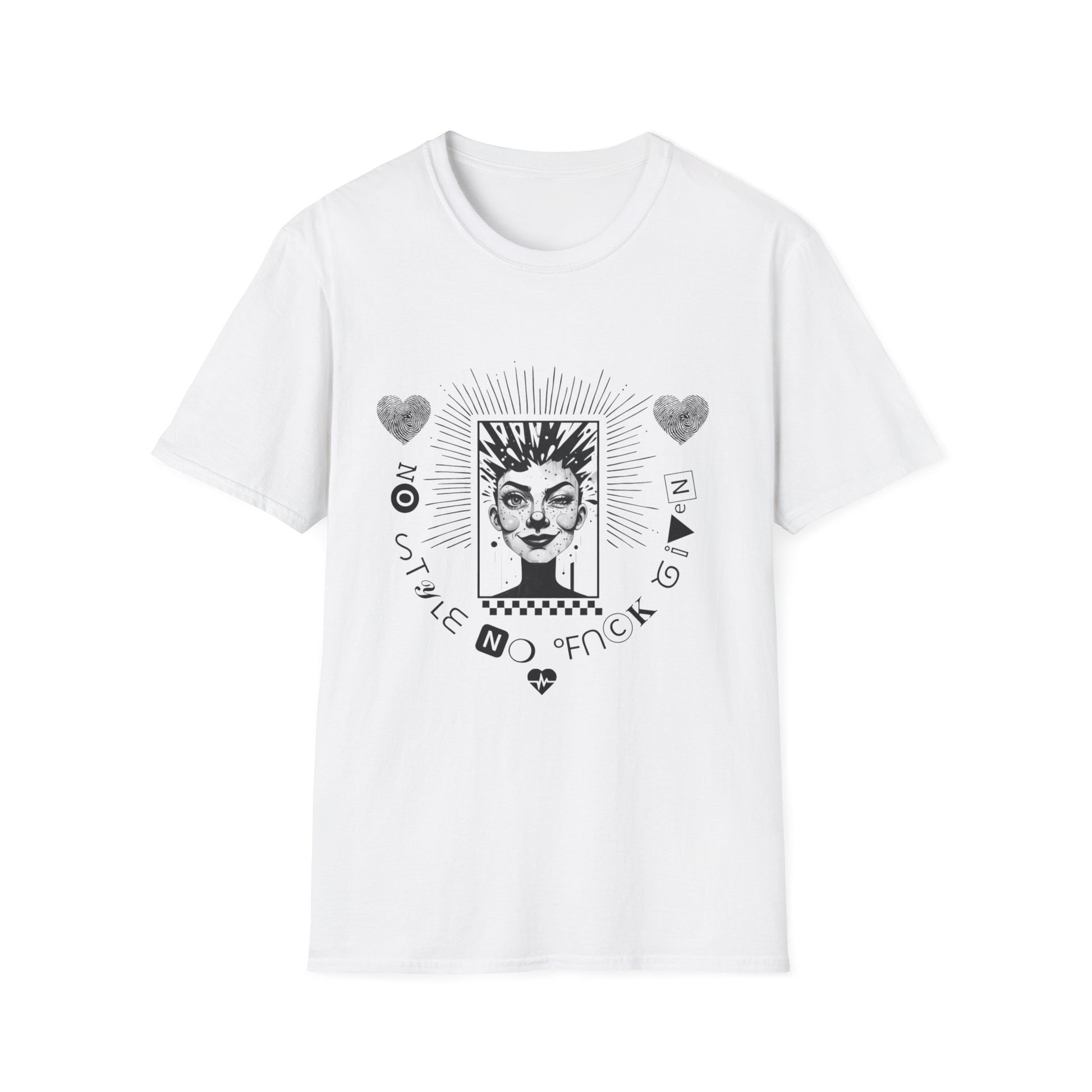 A lightweight, cotton tee printed with a bold, slightly surreal portrait and hand-drawn symbols—hearts, rays, and playful letterforms—arranged like a small altar on the chest. The soft ring-spun fabric drapes easily and breathes through warm days, while the tubular, seam-free body keeps the silhouette clean and minimal. Wear it with lived-in jeans and a favorite jacket for an offbeat, artsy look that reads like a quiet declaration: confident, curious, and a little mysterious. The understated back keeps attention forward, letting the front illustration tell the story.