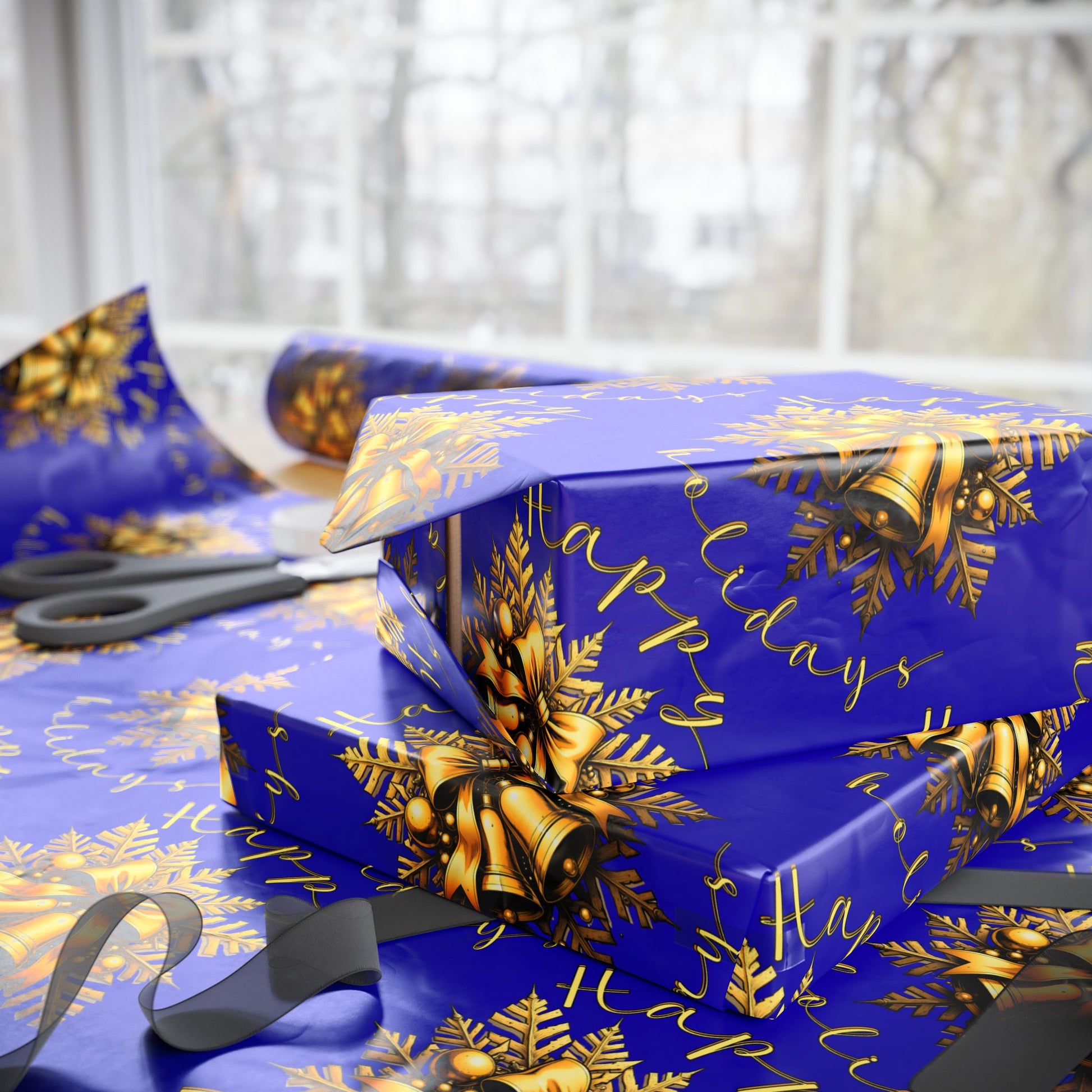 Royal Blue & Gold Holiday Wrapping Paper Roll — Elegant Floral Wreath Pattern