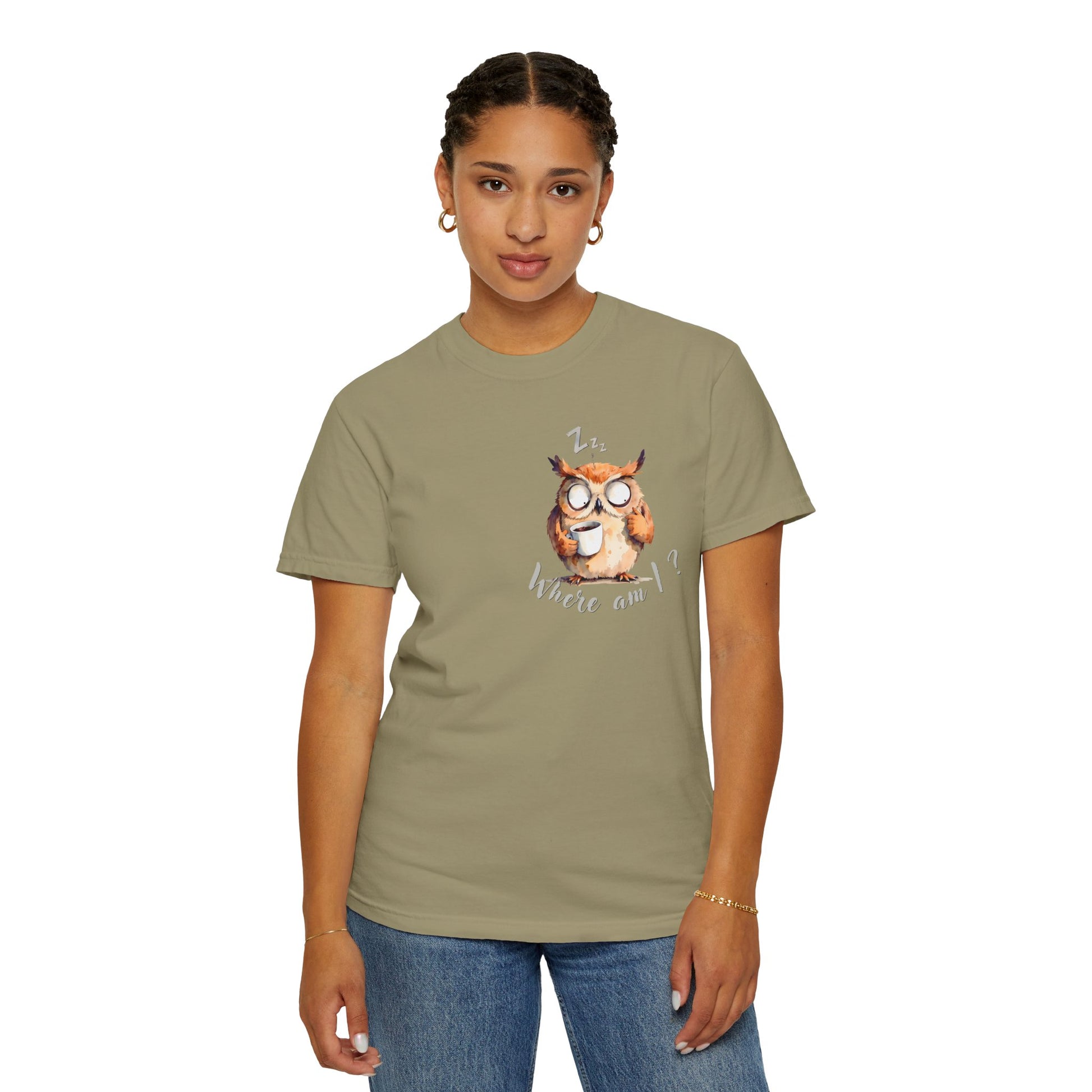 Soft, lived-in cotton with a quiet sense of humor. This relaxed-fit tee features a hand-painted owl clutching a tiny map, eyes wide and slightly puzzled, with the handwritten caption “Where am I?”—a small story stitched into your everyday wardrobe. Wear it on slow mornings with coffee, on woodland walks that end at an unfamiliar trailhead, or when you want an unpretentious conversation starter. The garment-dyed fabric feels broken-in from day one; the tubular knit and double-needle seams keep the shape while the sewn-in label and medium-weight cotton make it wearable year-round. Subtle, warm, and a little whimsical—this shirt belongs to people who like quiet details and gentle laughs.