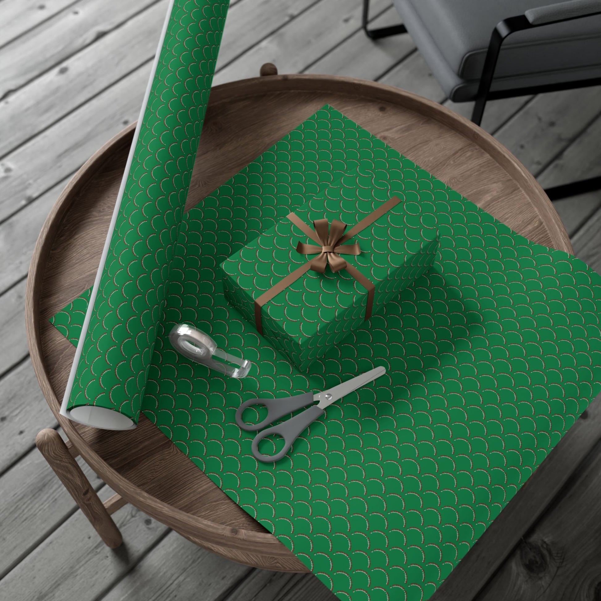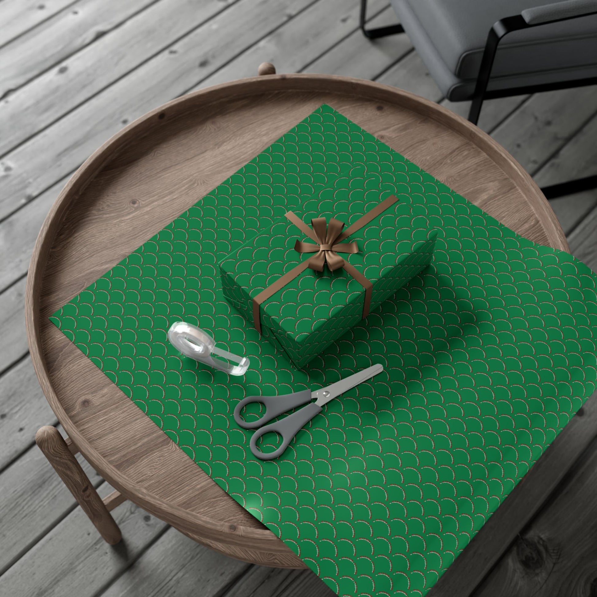 A roll of elegant, durable gift wrap printed with a repeating scallop motif in rich emerald and soft metallic accents. The paper lays flat and folds cleanly around boxes or odd-shaped items without cracking, while the satin or matte finishes let you choose a subtle sheen or a more subdued look. Printed with water-based, Greenguard-certified inks, this wrap keeps colors bright and crisp while staying eco-conscious and recyclable. Tied with twine and a simple tag, it transforms a wrapped present into a thoughtful, low-fuss moment — whether you’re trimming the tree, dressing up a hostess contribution, or wrapping a heartfelt birthday surprise.